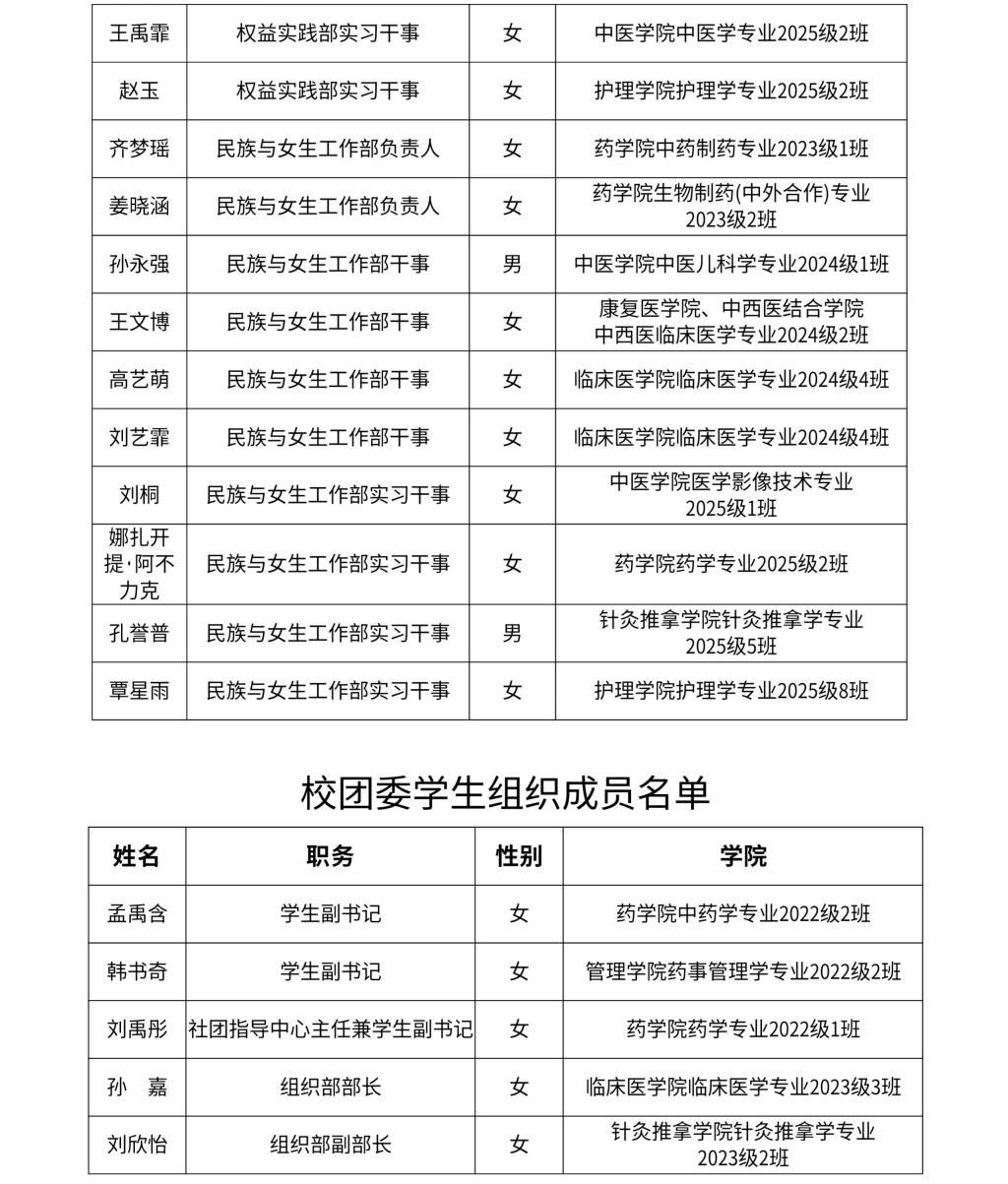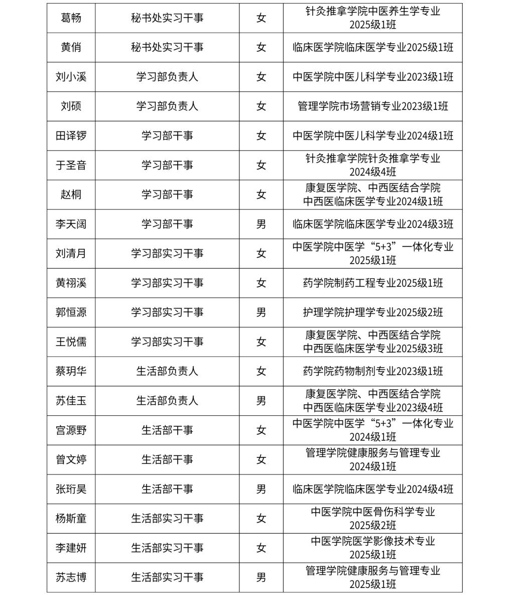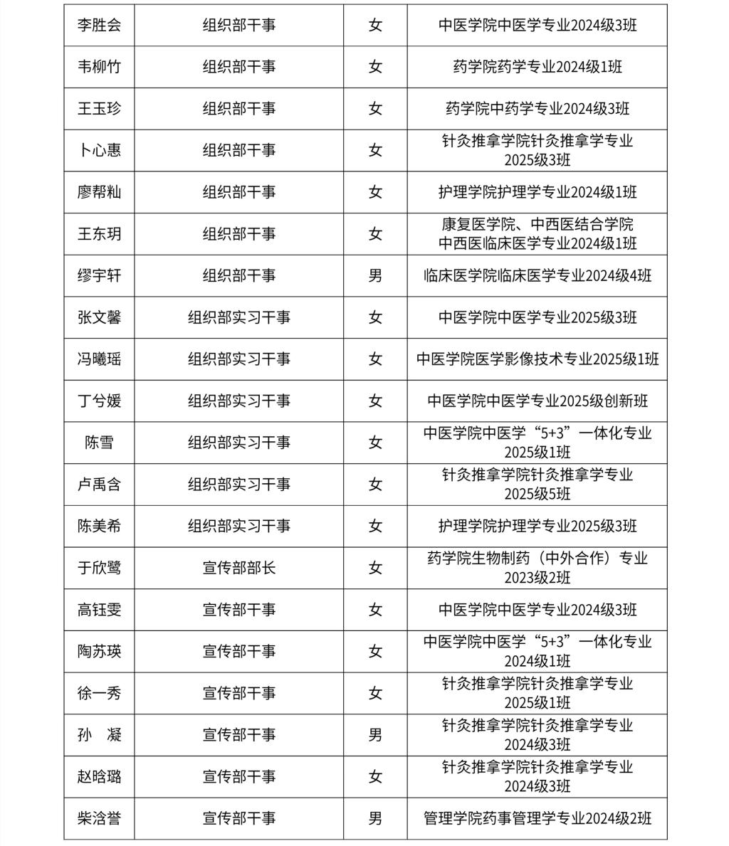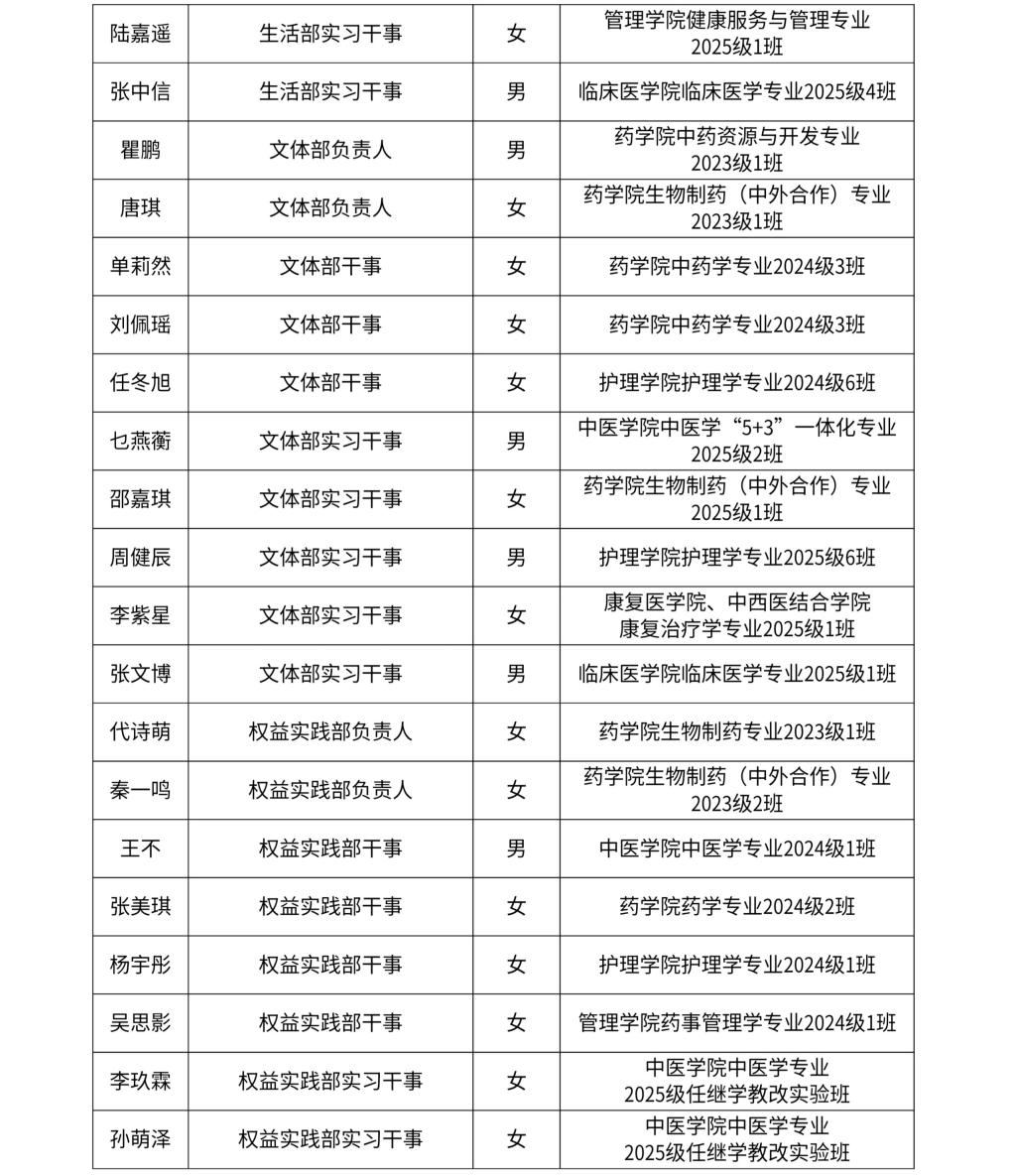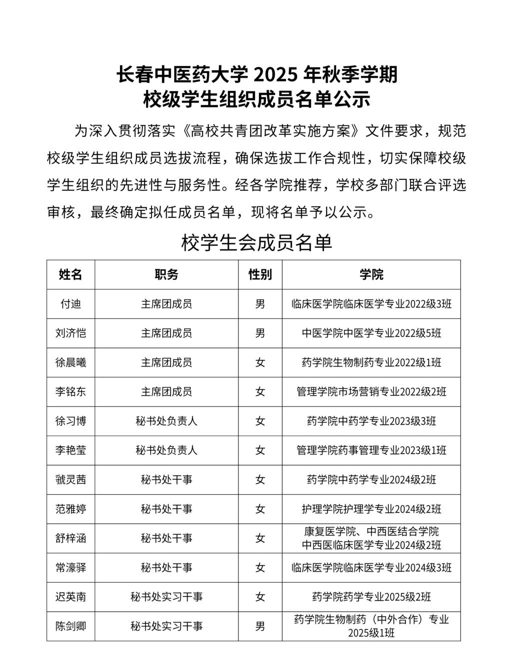 长春中医药大学2025年秋季学期校级学生组织成员名单公示