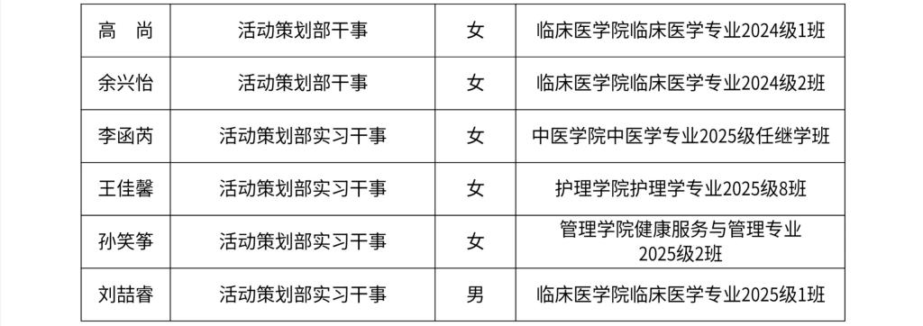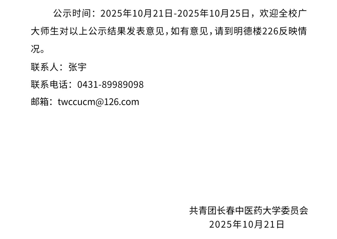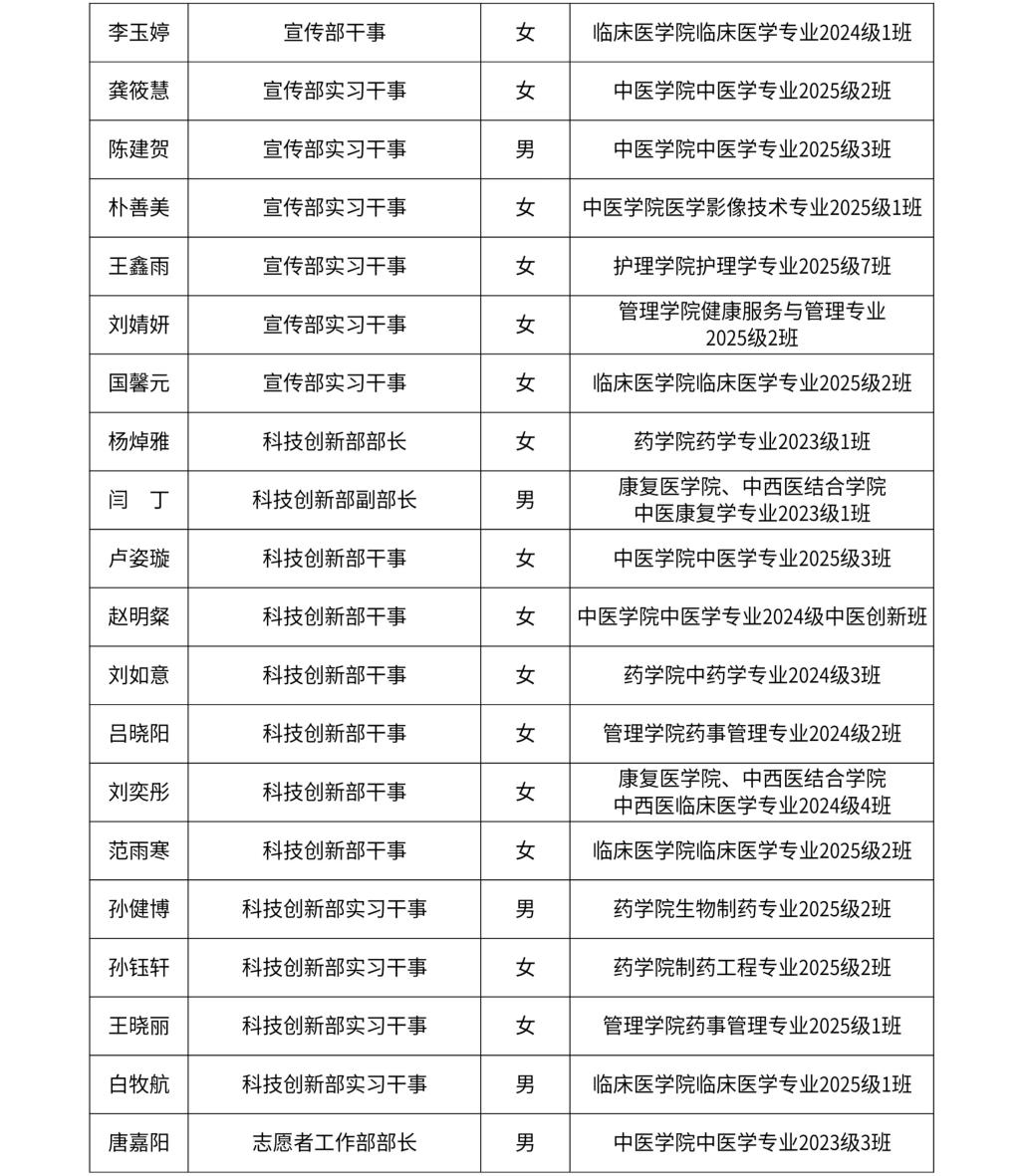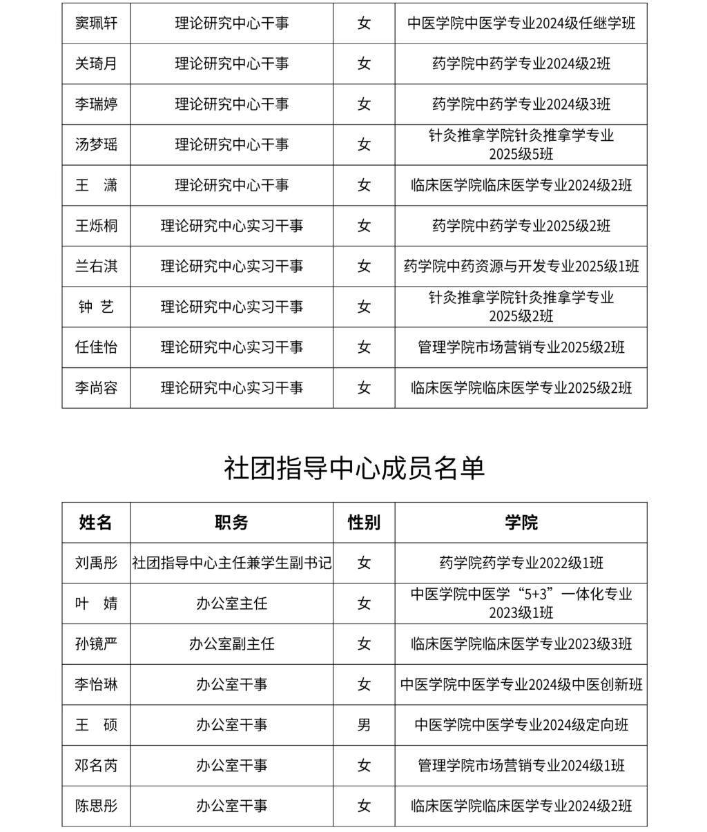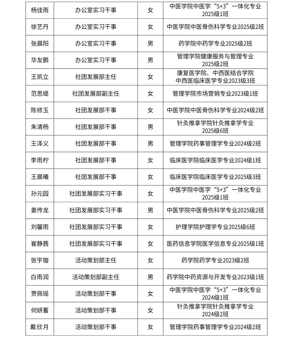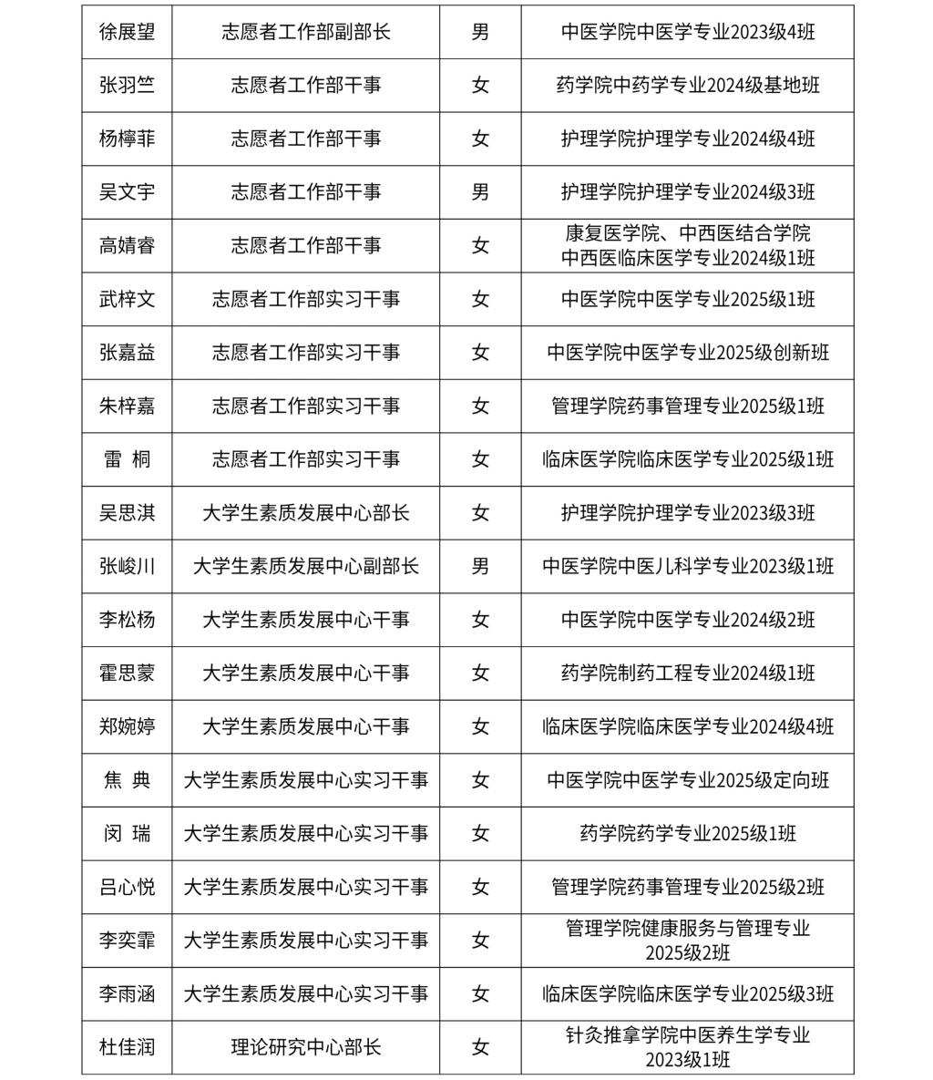 长春中医药大学2025年秋季学期校级学生组织成员名单公示